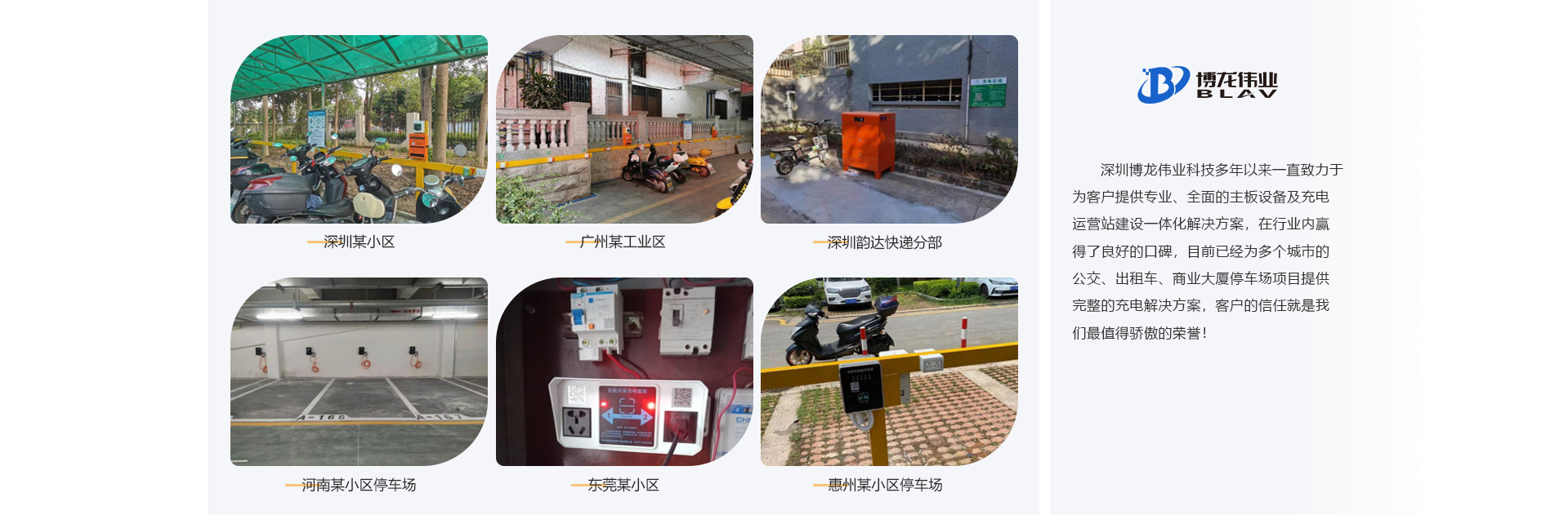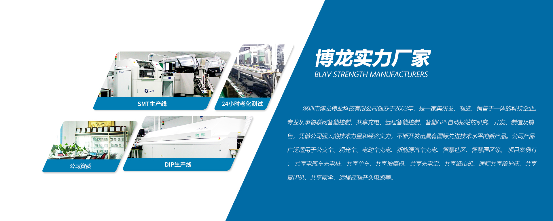 深圳市博龍偉業科技有限公司創(chuàng)辦于2002年,是一家集研發(fā)、制造、銷售于一體的科技企業。專業從事物聯網智能控制、共享充電、遠程智能控制、智能GPS自動報站的研究、開發(fā)、制造及銷售,憑借公司強大的技術力量和經濟實力,不斷開發(fā)出具有國際先進技術水平的新產品。公司產品廣泛適用于公交車、觀光車、電動車充電、新能源汽車充電、智慧社區、智慧園區等。 項目案例有: 共享電瓶車充電樁,共享單車、共享按摩椅、共享充電寶、共享紙巾機、醫(yī)院共享陪護床、共享復印 機、共享雨傘、遠程控制開頭電源等。